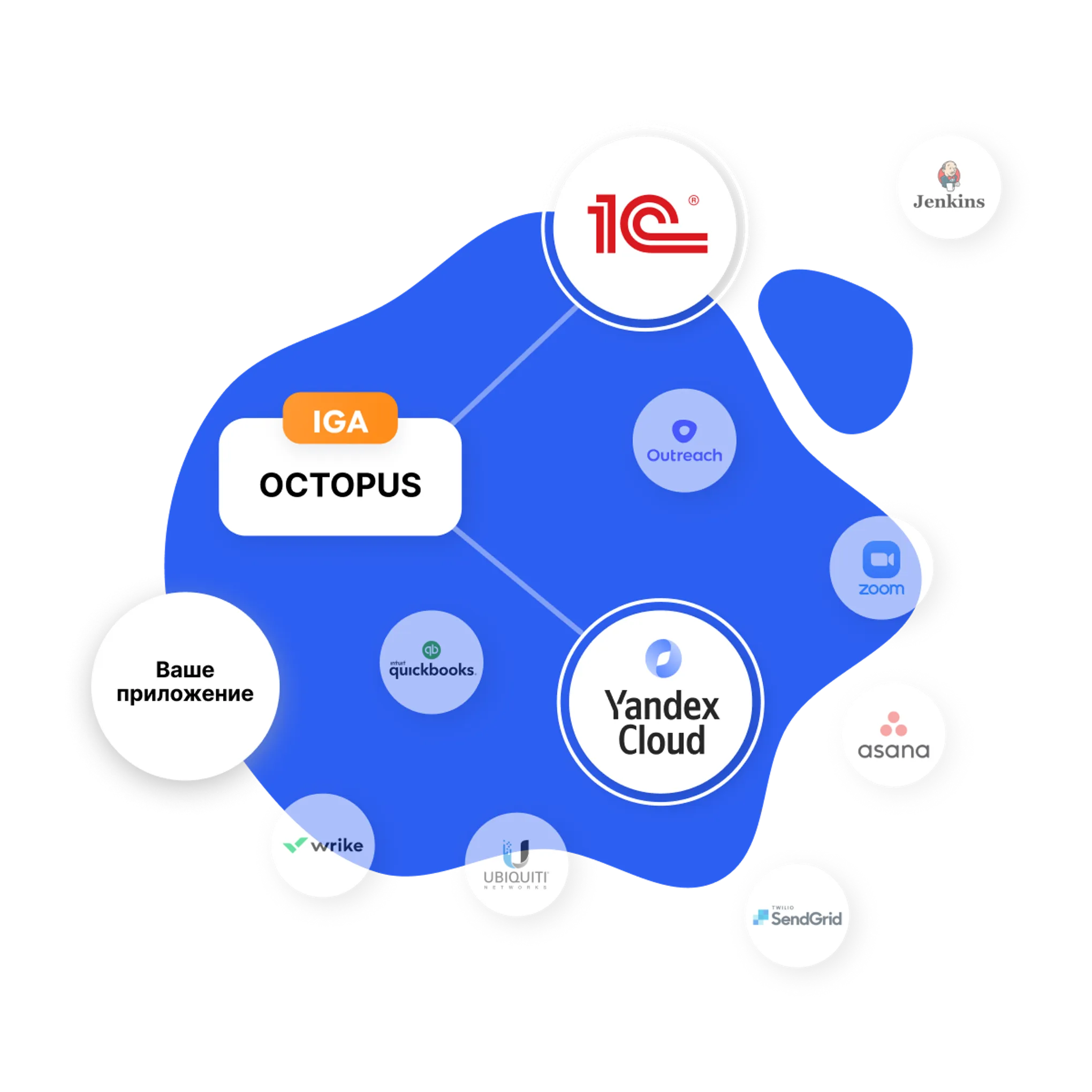 Решение имеет множество коннекторов, доступных "из коробки", таких как Microsoft Active Directory, 1C, Office 365, Google Workspace, Atlassian Jira, Github, Yandex Cloud и другие.
